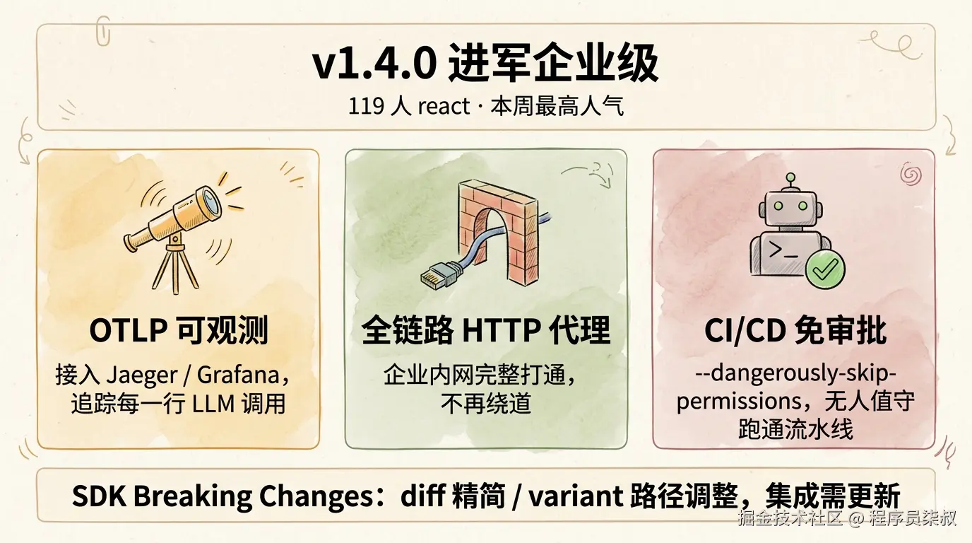 | v1.4.0 | Stable | 2026-04-08 | OTLP/HTTP 代理/PDF 拖拽/dangerously-skip 权限 |