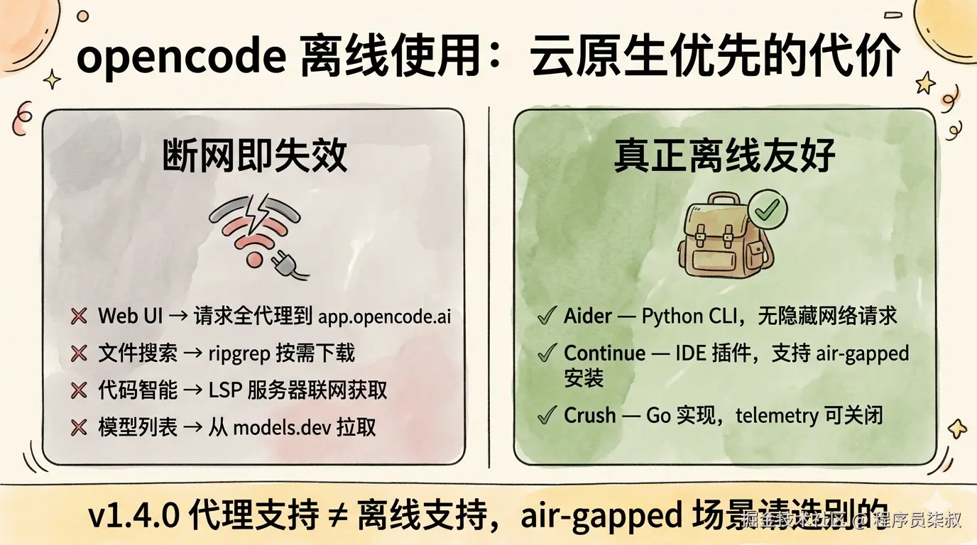 社区共识:opencode 的定位是"云优先 AI coding agent",不适合 air-gapped 环境。官方团队目前没有将离线支持列为路线图优先项的迹象。