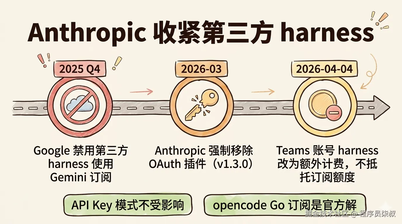 规律:AI 提供商正在逐步收紧对第三方 harness 使用订阅额度的限制,路径从"OAuth 认证"(被切断)到"订阅额度使用"(改为额外计费)。