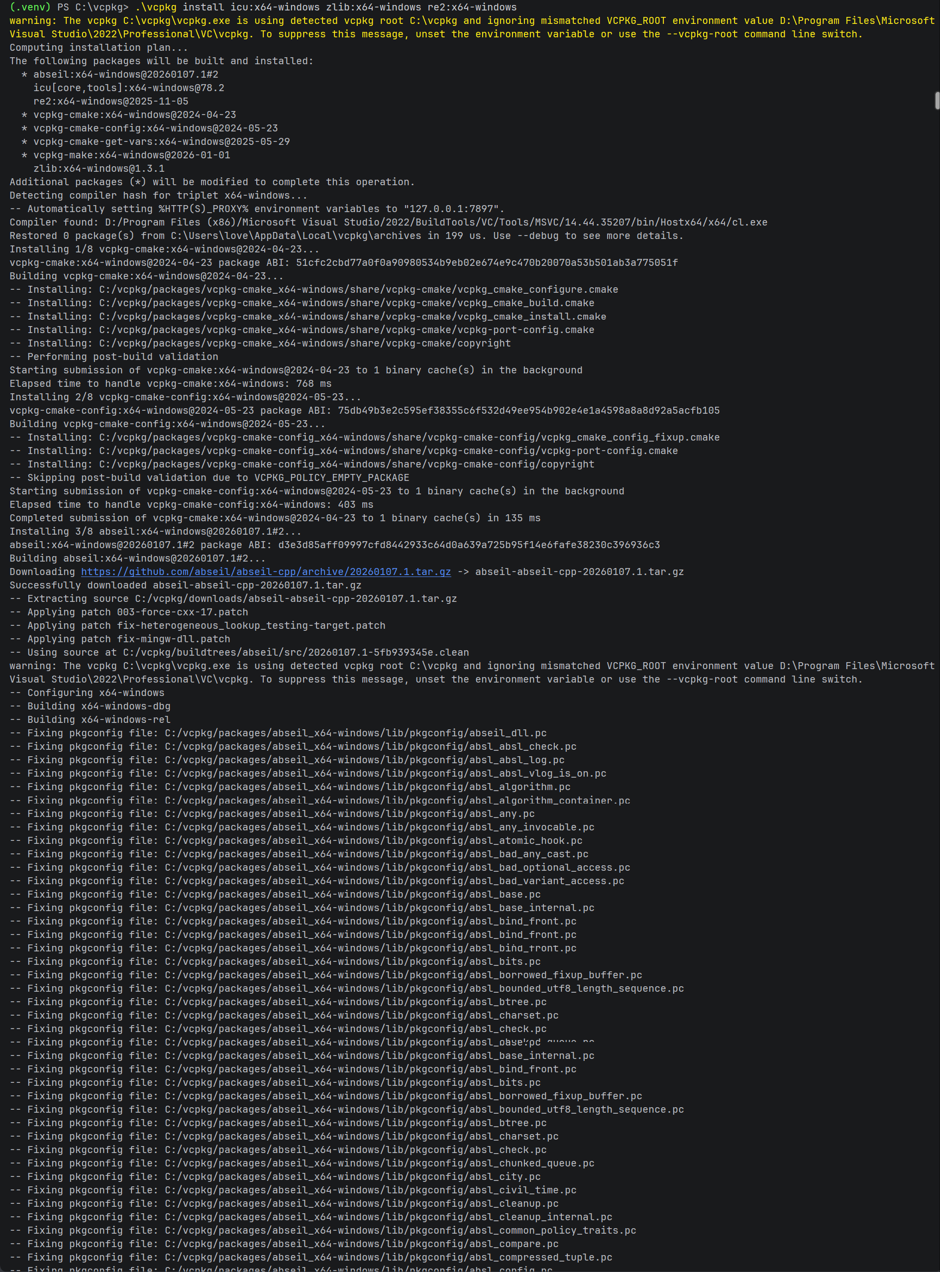 文章摘要:记录如何利用 vcpkg 快速解决 C++ 项目在 Windows 下缺失底层依赖(如 ICU, RE2, ZLIB)的问题。