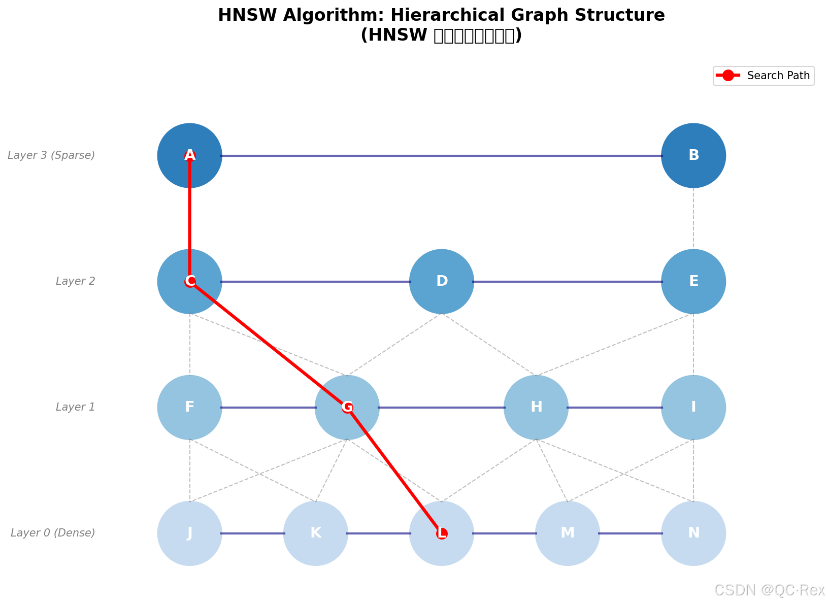 HNSW 是目前最流行的 ANN 算法之一,其核心思想是构建多层图结构: