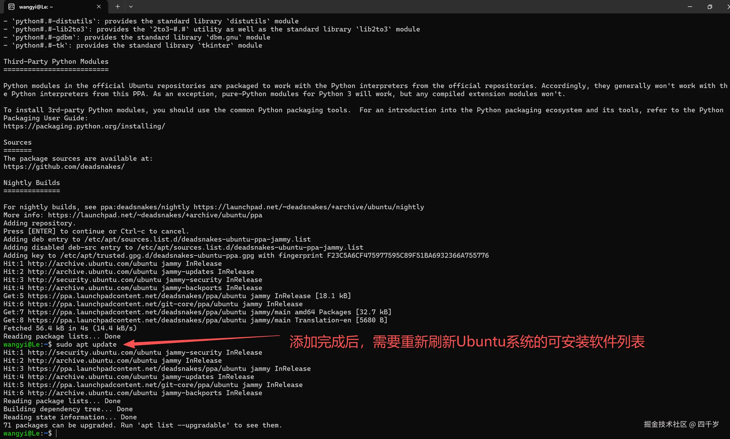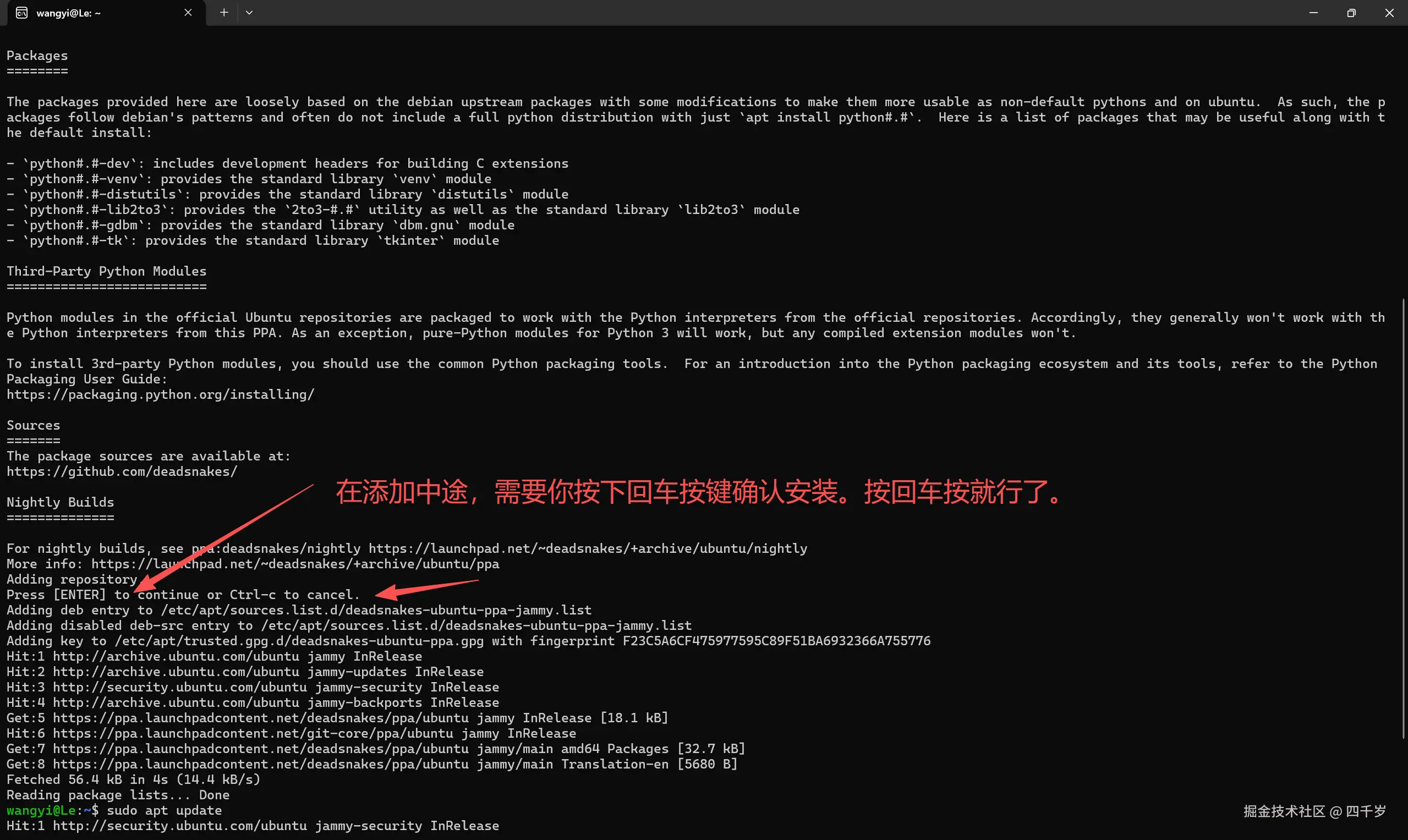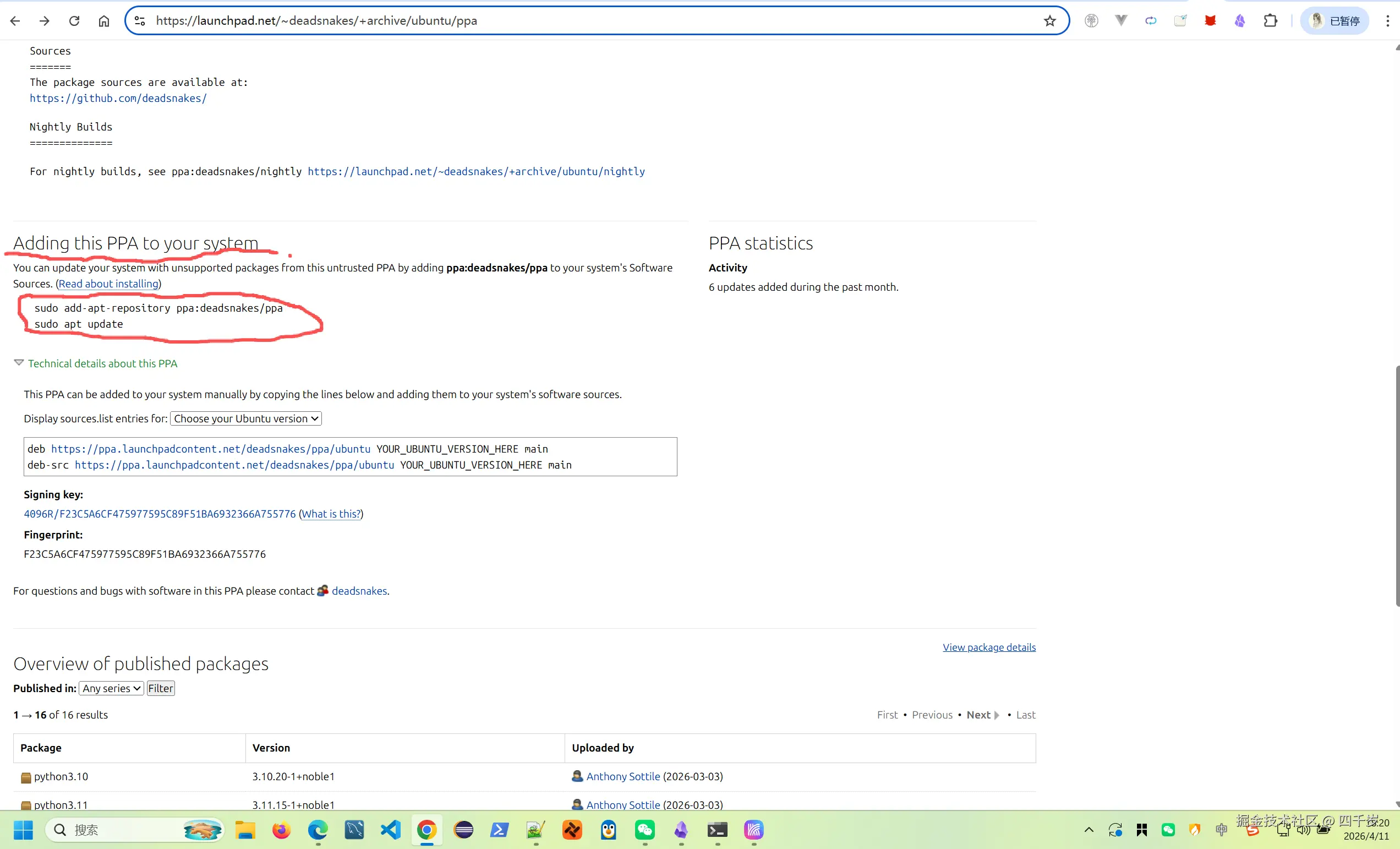 第二,添加deadsnakes这个第三方软件源地址,用来安装较高版本的Python。software-properties-common软件安装成功之后,该软件会提供一个命令add-apt-repository,通过该命令我们可以给Ubuntu系统添加第三方软件源地址。查看deadsnakes官方网站 可知具体安装命令如下: