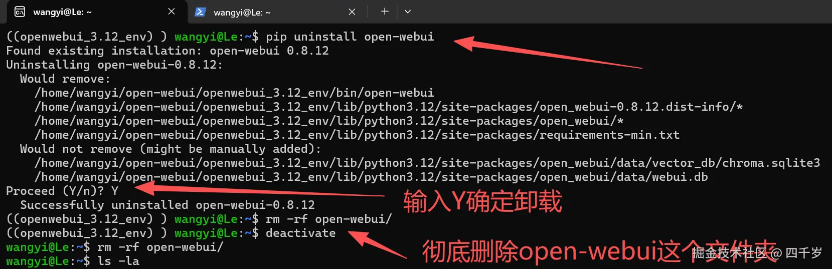 若因 OpenWebUI 安装包体积较大,导致磁盘空间不足,可通过以下命令卸载 OpenWebUI: