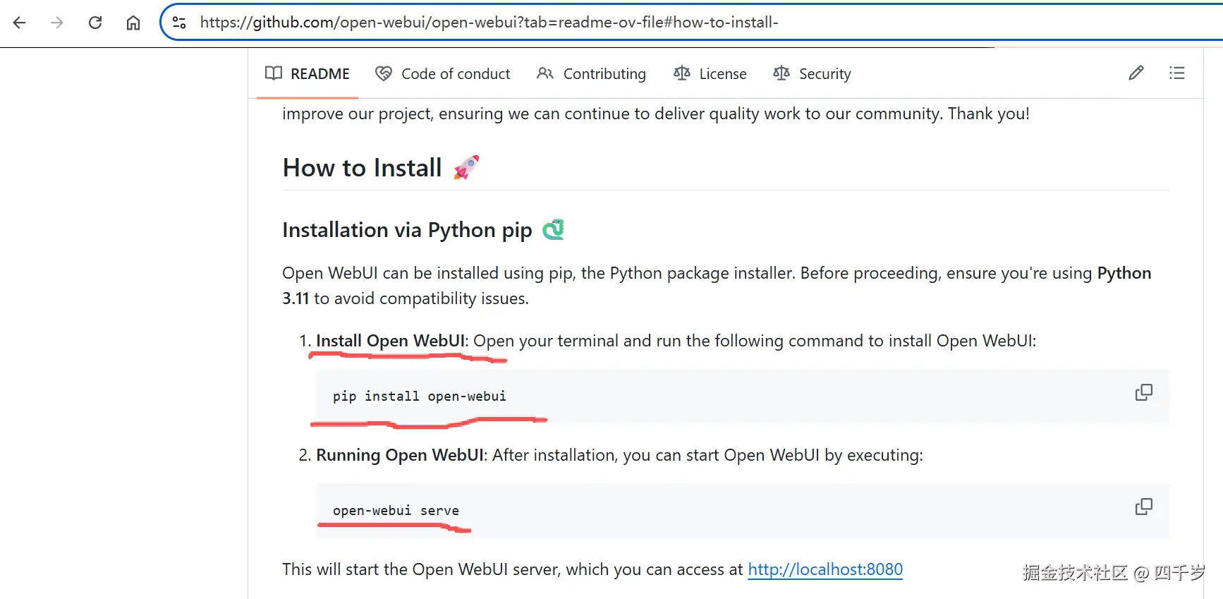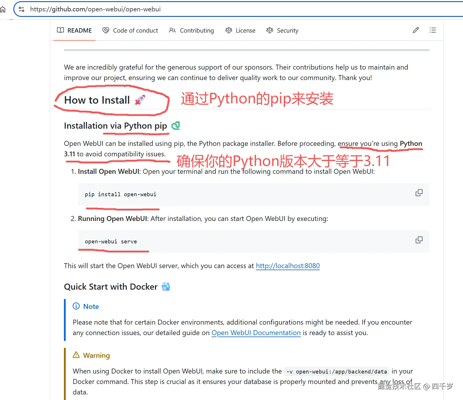 查看open-webui的安装说明可以知道OpenWebUI的安装依赖Python,并且Python的版本必须大于等于 3.11 并且小于 3.13,不包含 Python3.13 版本。这是因为 Python 3.13 移除了多个底层模块(如 asyncio 部分 API 变更、distutils 彻底废弃),且 AI 生态的核心依赖库(pydantic v2、fastapi、llama-cpp-python、onnxruntime 等)尚未完成针对 3.13 版本的全面兼容性测试。