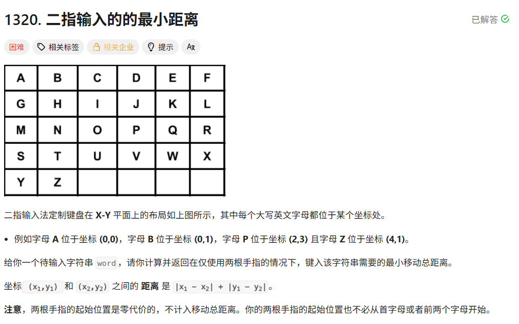 题目链接:力扣 1320. 二指输入的的最小距离