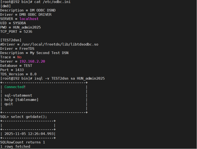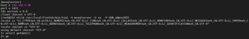 /usr/local/freetds/bin/tsql -H 192.168.2.20 -p 1433 -U sa -P HUN_admin2025 -D TEST