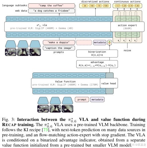 - 中间上方:带 advantage conditioning 的 π*0.6 VLA。