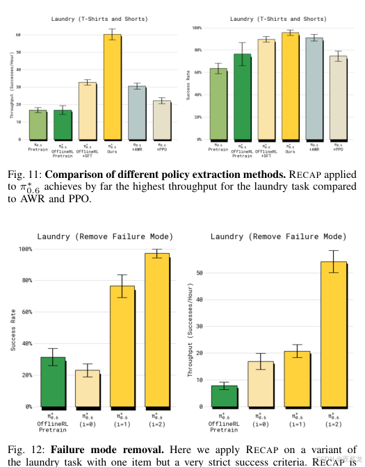 - 最关键的结果是什么:在 espresso、diverse laundry、box assembly 这类长时序真机任务上,RECAP 显著提高 success rate 和 throughput;在最难任务上,吞吐提升可超过 2 倍,失败率大约减半。