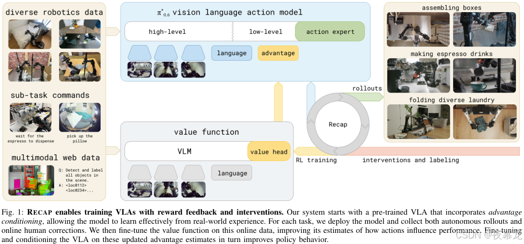 - 底部横向流程:真实部署收集 rollouts / interventions / labeling,再回流到 RL training,形成 RECAP 闭环。