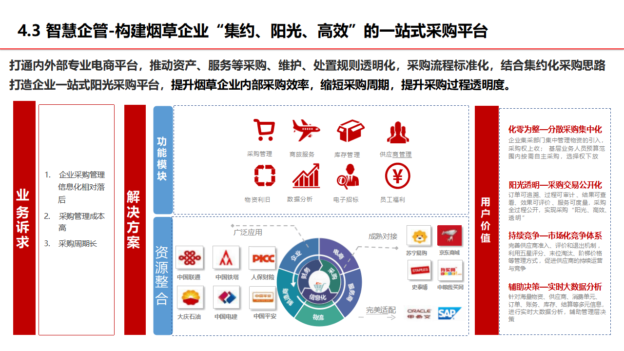 - 全流程透明: 打通内外部电商平台,实现从需求提报、寻源采购到履约结算的全流程在线化。