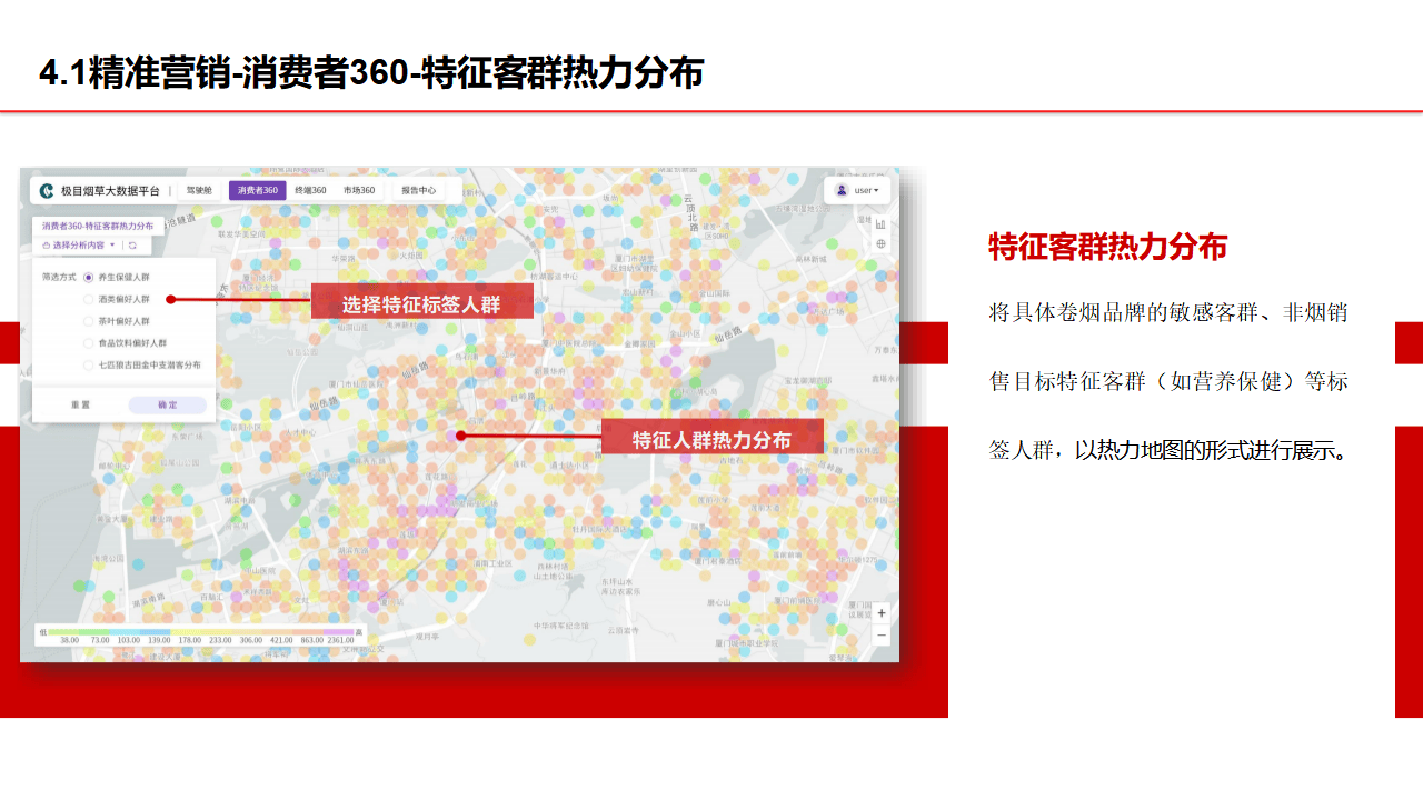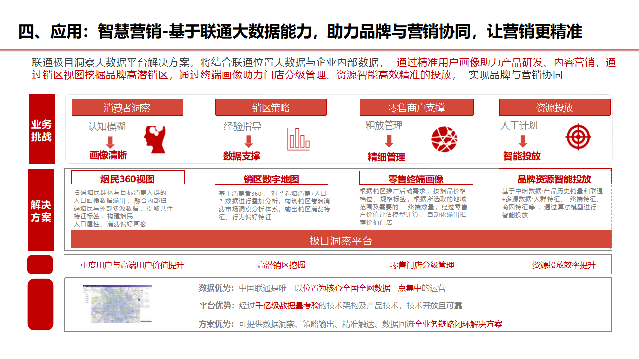 传统的烟草营销往往依赖经验判断,缺乏对消费者真实画像的了解。该方案通过融合联通极目洞察大数据(位置数据、人口属性、消费偏好)与烟草内部的POS扫码数据,构建了全方位的消费者画像体系。