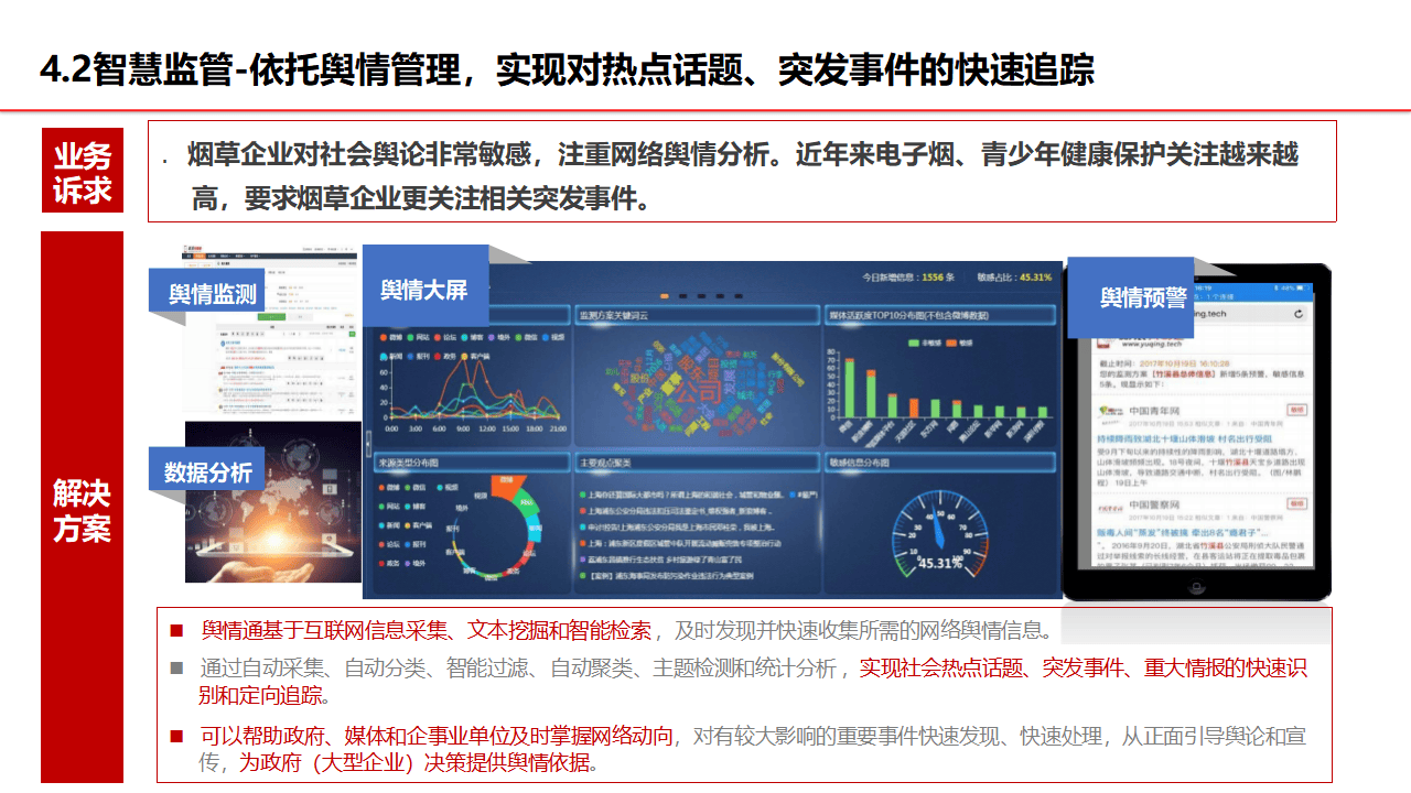 烟草行业对舆论极为敏感。方案引入了"舆情通"系统,利用文本挖掘和智能检索技术: