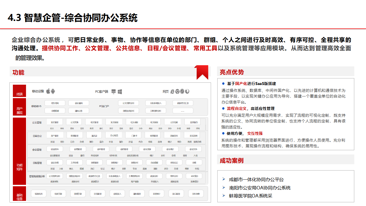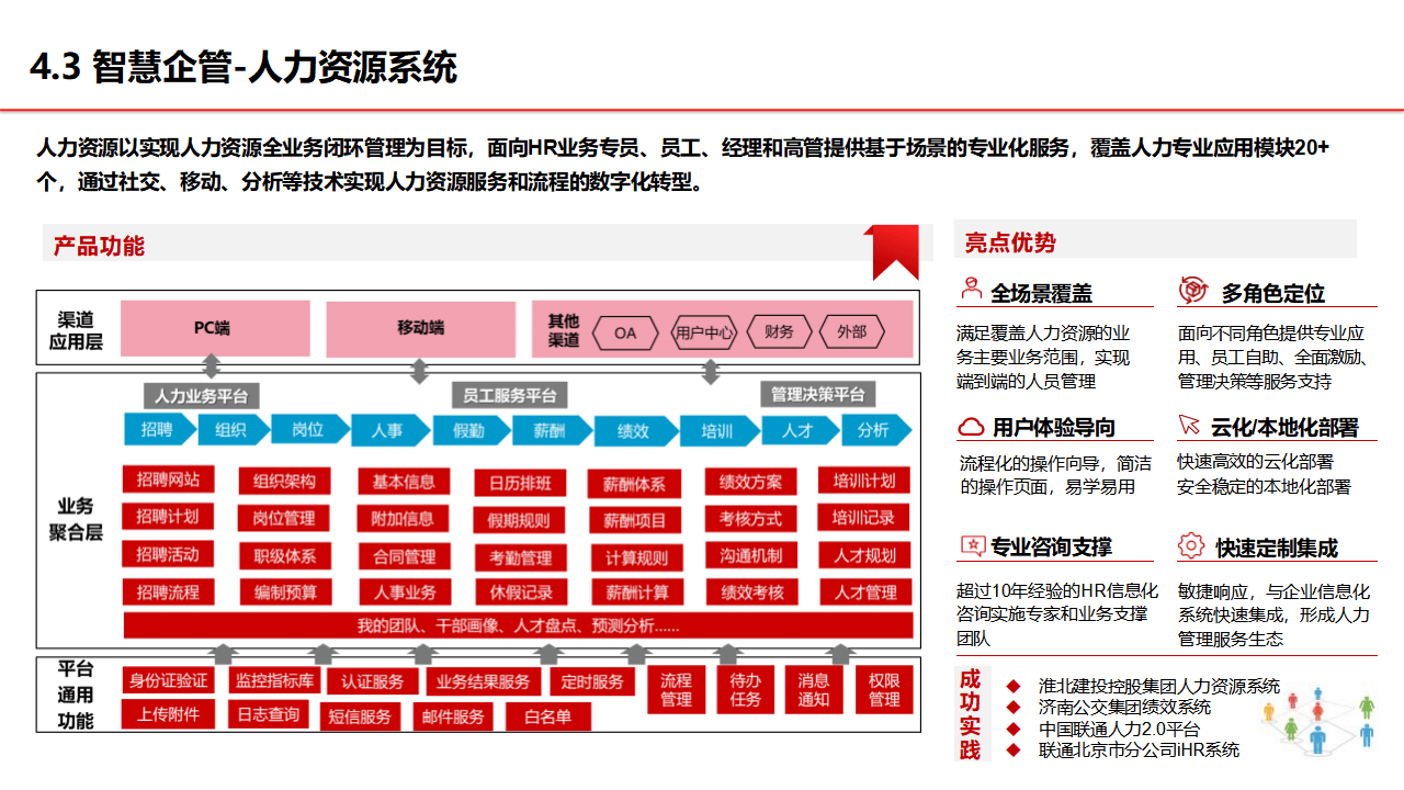 - 智慧HR: 覆盖招聘、培训、绩效、薪酬全生命周期,提供员工自助服务,提升员工体验。