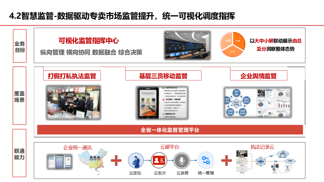 - 工作手机+执法仪: 构建移动执法监管平台。通过"云录音、云定位、云名片"技术,实现对专卖管理员、客户经理、送货员(三员)的全过程数字化管理。