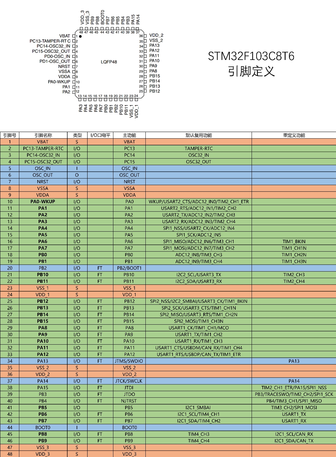 关键点 :在 "默认复用功能" 列中,如果某个引脚标注了 TIMx_CHy(比如 TIM3_CH1),就表示它可以作为定时器 TIM3 的通道 y 输出 PWM。