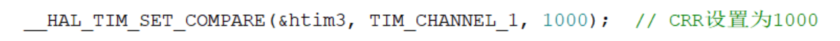 __HAL_TIM_SET_COMPARE(&htim3, TIM_CHANNEL_1, 1000); 这个函数的作用是:设置定时器 TIM3 的通道 1 的比较值(也就是占空比的控制值)为 1000 其中占空比比例为 1000 /(ARR+1)=1000 / (1999+1)= 50%