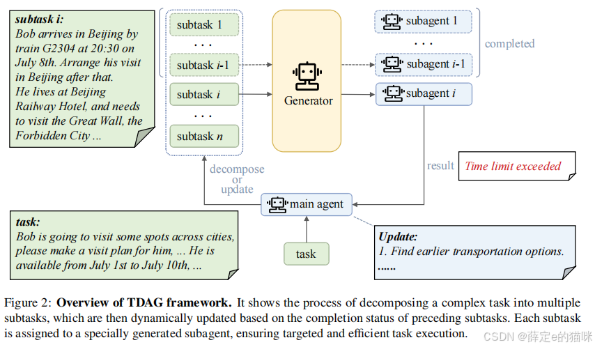 TDAG: A Multi-Agent Framework based on Dynamic Task Decomposition and Agent Generation 试图回答的正是这个问题。论文指出,现有方法的主要瓶颈不只是"能力不够",而是任务分解过于静态、子代理适配性不足、评估粒度过粗 。为此,作者提出了 TDAG 框架:通过动态任务分解 、面向子任务的代理生成 以及增量式技能库 ,提升 Agent 在复杂场景中的适应能力;同时构建了 ItineraryBench,用更细粒度的方式评估复杂任务中的中间完成度。
