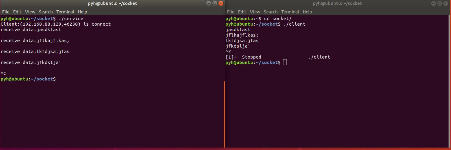 int fd = -1;struct sockaddr_in sin; //1.socket fd = socket(AF_INET,SOCK_STREAM,0); if(fd<0) { perror("socket"); exit(1); } bzero(&sin,sizeof(sin)); sin.sin_family = AF_INET; sin.sin_port = htons(SERV_IP); //sin.sin_addr.s_addr = inet_addr(SERV_IP_ADDR); sin.sin_addr.s_addr = INADDR_ANY; /*if(inet_pion(AF_INET,SERV_IP_ADDR,(void *)sin.sin_addr.s_addr) != 1) { perror("inet_pton"); exit(1); } */ //2.bind if(bind(fd,(struct sockaddr *)&sin,sizeof(sin)) <0) { perror("bind"); exit(0); } //3.listen if(listen(fd,BACKLOG) < 0) { perror("listen"); exit(1); } //4.accept /*int newfd = -1; newfd = accept(fd,NULL,NULL); if(newfd < 0) { perror("accept"); exit(1); } */ int newfd = -1; struct sockaddr_in cin; socklen_t addrlen = sizeof(cin); newfd = accept(fd,(struct sockaddr *)&cin,&addrlen); if(newfd < 0) { perror("accept"); exit(1); } char ipv4_addr[16]; if(!inet_ntop(AF_INET,(void *)&cin.sin_addr,ipv4_addr,sizeof(cin))) { perror("inet_ntop"); exit(1); } printf("Client:(%s,%d) is connect\n",ipv4_addr,ntohs(cin.sin_port)); char buf[BUFSIZE]; int ret = -1; //read while(1) { do { bzero(buf,BUFSIZE); ret = read(newfd,buf,BUFSIZE-1); }while(ret < 1); if(ret < 0) { exit(1); } if(!ret) { break; } printf("receive data:%s\n",buf); if(!strncasecmp(buf,QUIT_STR,strlen(QUIT_STR))) { printf("Client is exiting!\n"); break; } } close(newfd); close(fd); return 0;}