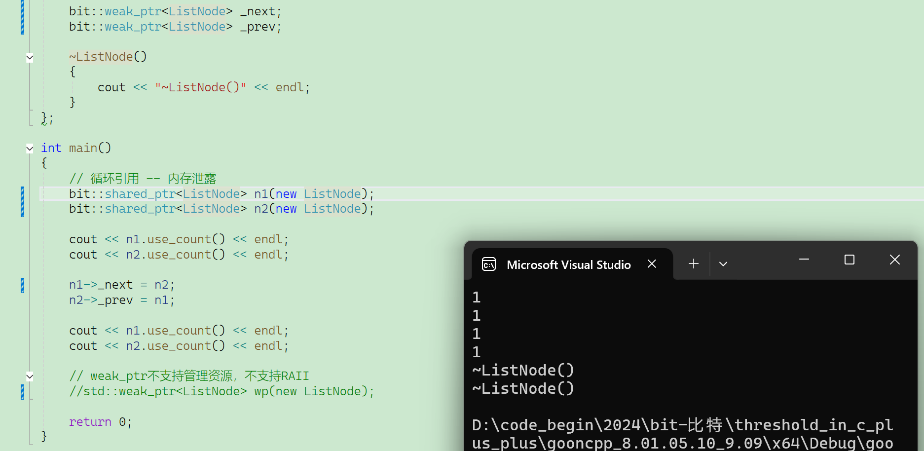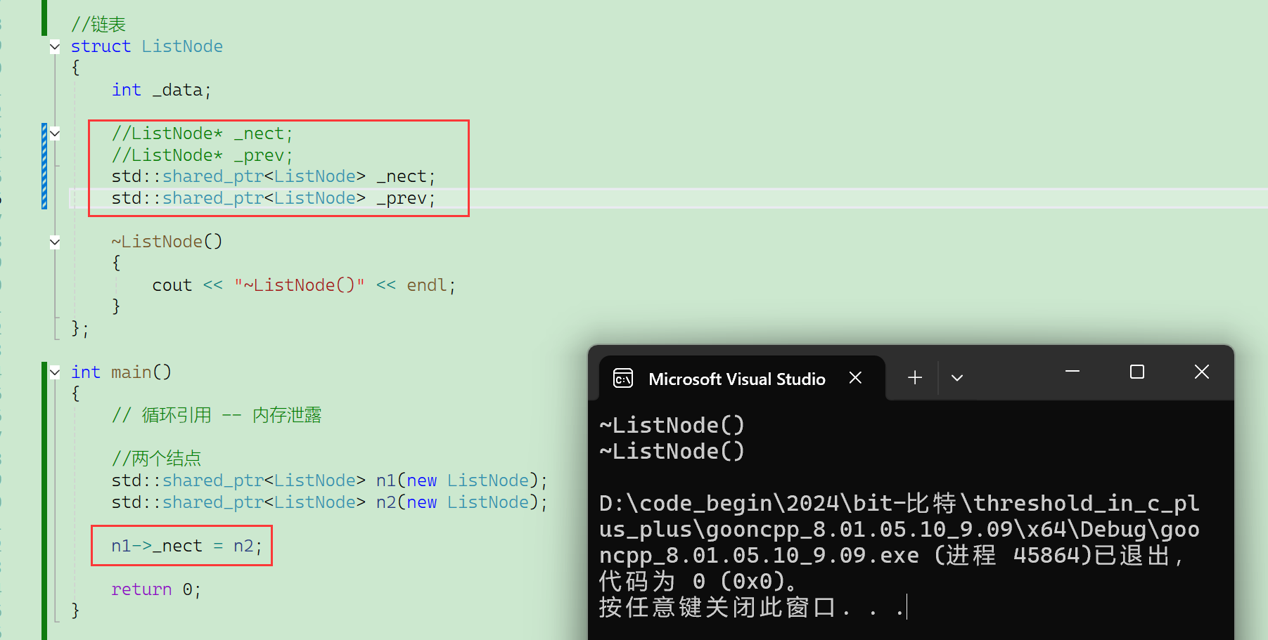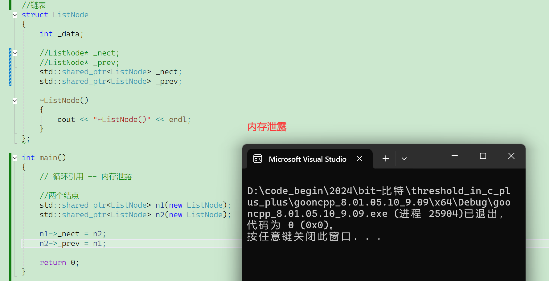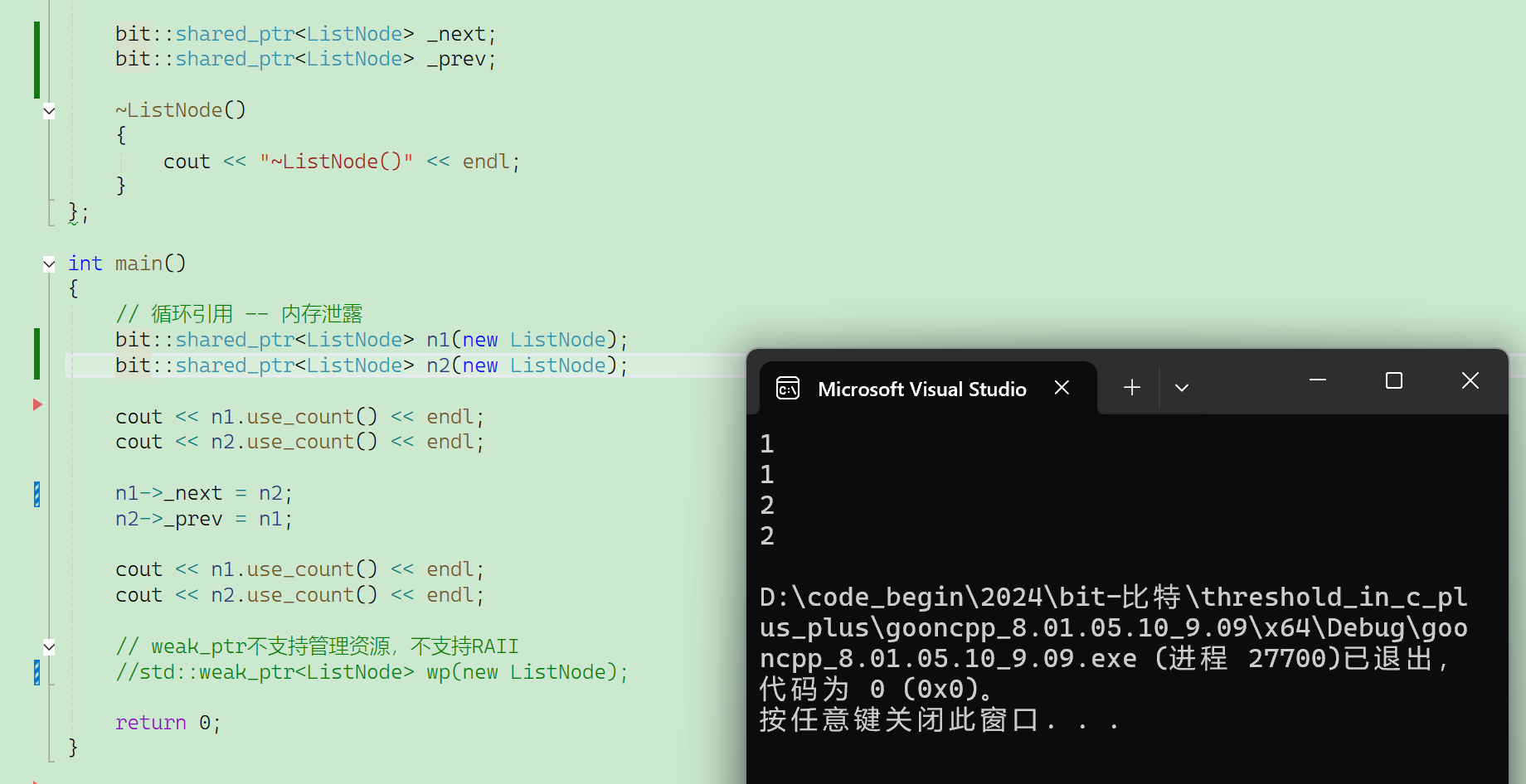 可以看到使用shared_ptr,循环引用的时候没有调用Node的析构,产生了内存泄露。