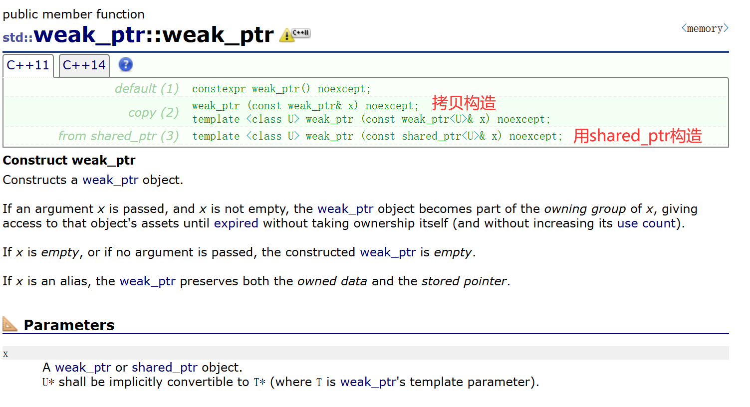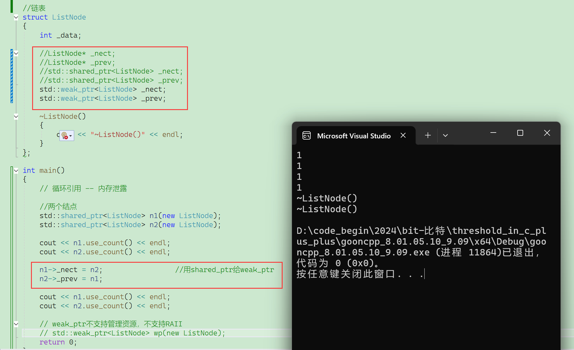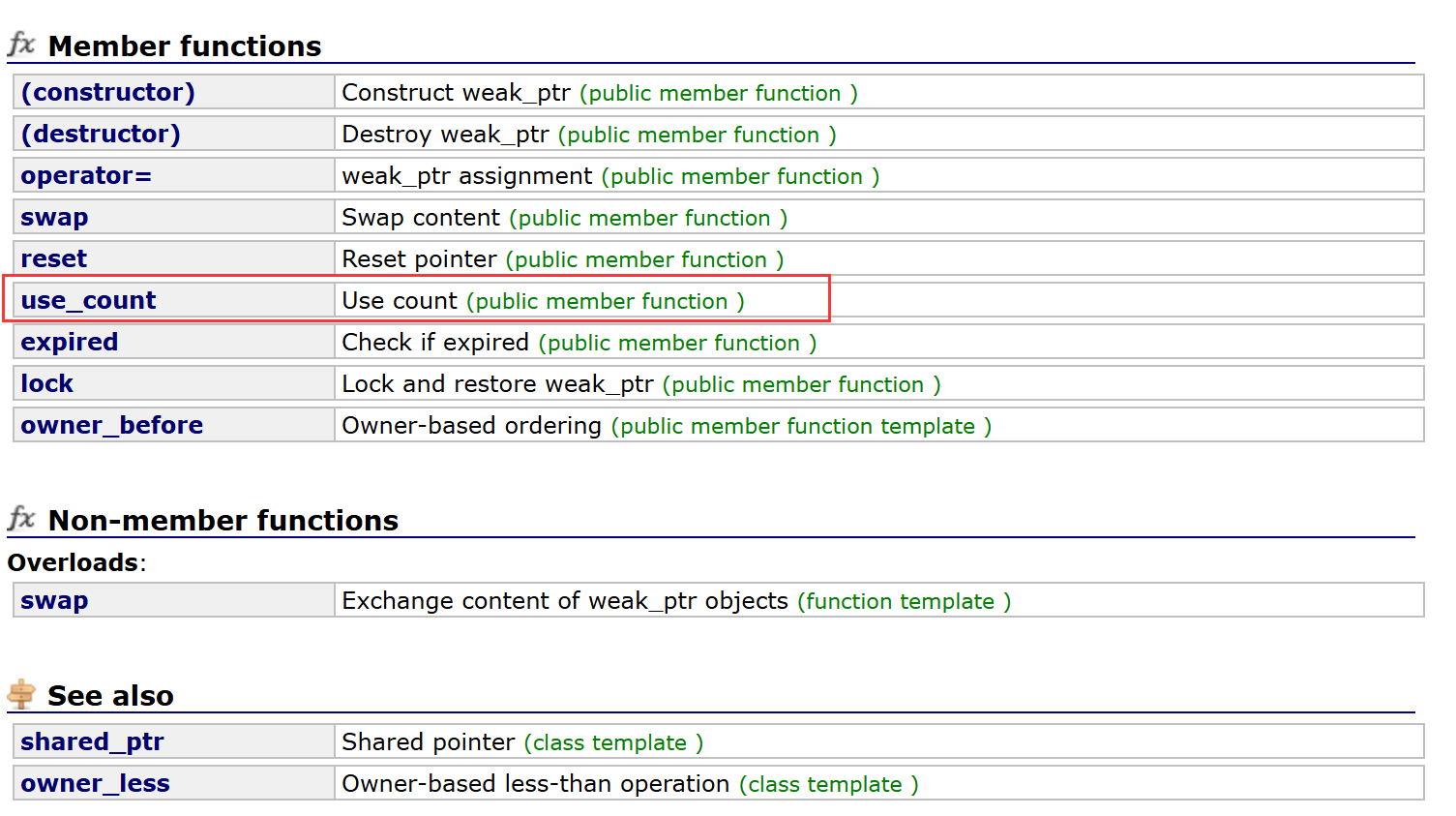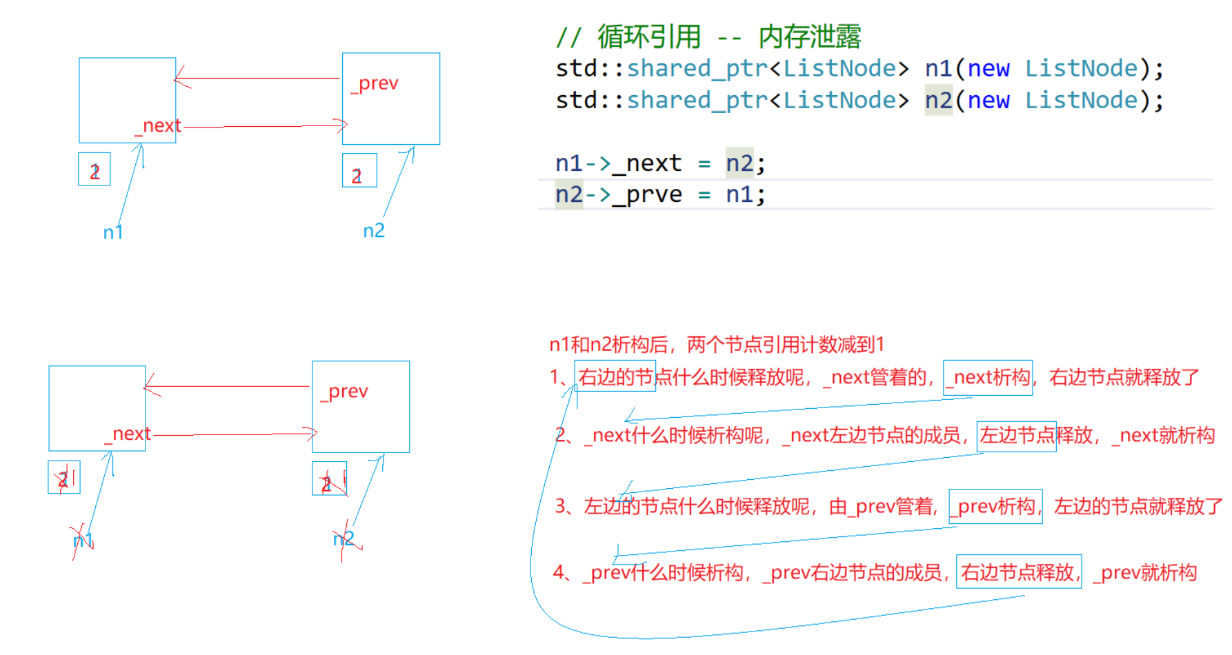为了解决这个问题,C++标准库(其实最先是boost库)专门搞出来了一个weak_ptr。
