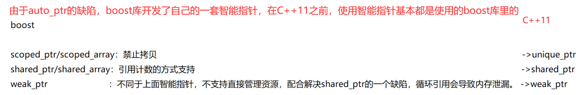 - C++ 11,引入了unique_ptr和shared_ptr和weak_ptr。需要注意的是unique_ptr对应boost的scoped_ptr。并且这些智能指针的实现原理是参考boost中的实现的。