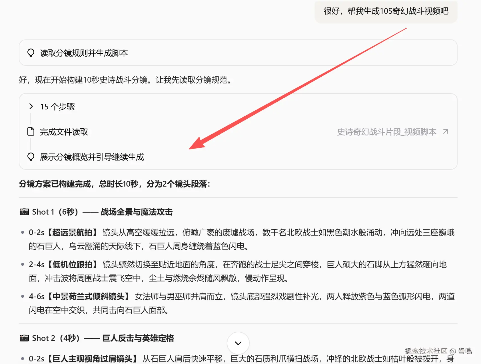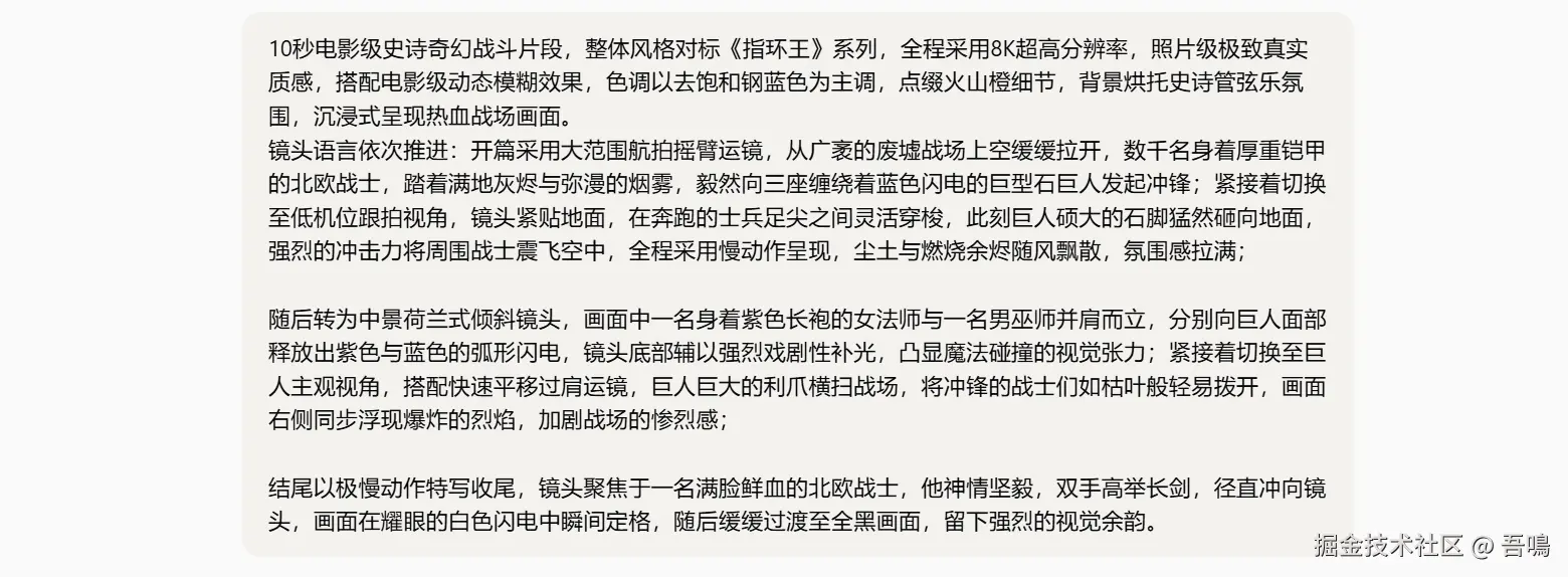 当我准备好让它帮我生成一段10秒电影级史诗奇幻战斗片段,风格参考指环王系列的风格,画面极具真实感......,很长的一段提示词,提示词如下图。