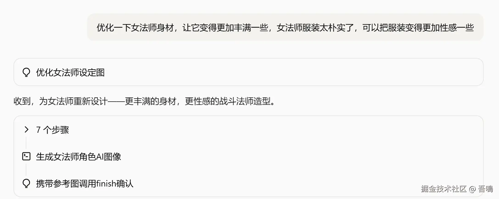这个时候如果对设计出来的人物或者场景有不满意的可以再做调整,比如在它给我设计的角色中,我觉得"女法师"这个角色不够有吸引力,所以对她的身材和服装都做了一下微调。
