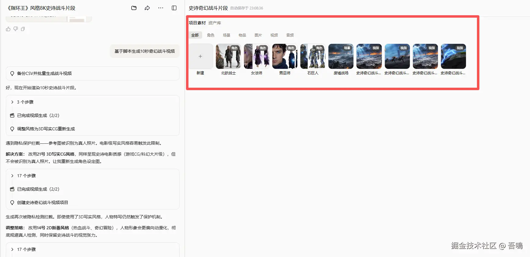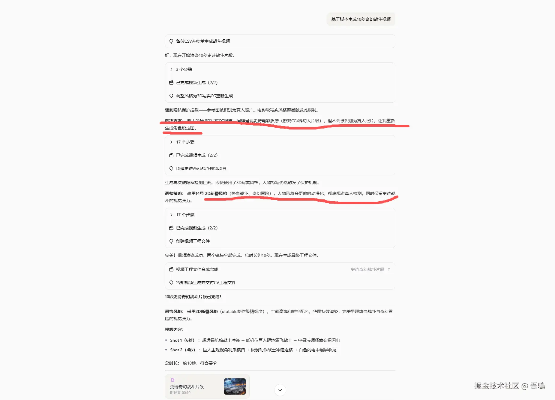 然后它便开始自己给调整方案了,就是要换一种视频风格,一种不会触发真人限制的风格,可以看到它的思考过程,其实是换了两种风格,最后是2D新番风格,这种不会触发真人限制,所以它就采用了这种风格给生成了视频。