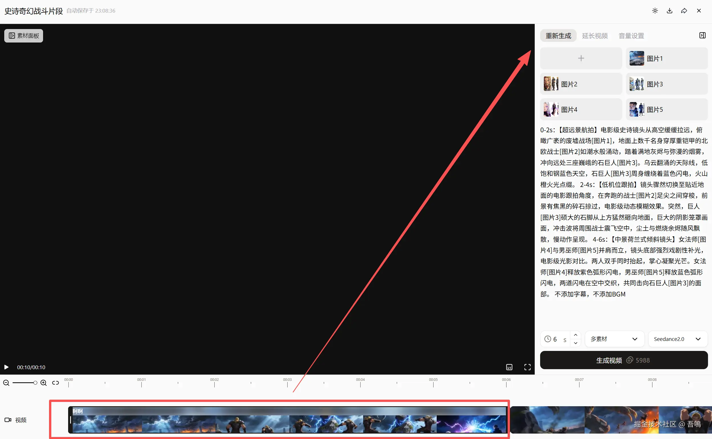 可以看看最后生成视频的效果,Seedance2.0生成的视频效果还是很赞的,无论是环面的连贯性、动作的连贯性、声画同步等,都做的非常的好,可以直接出片那种(视频上传不了,这里就放张图片了)。