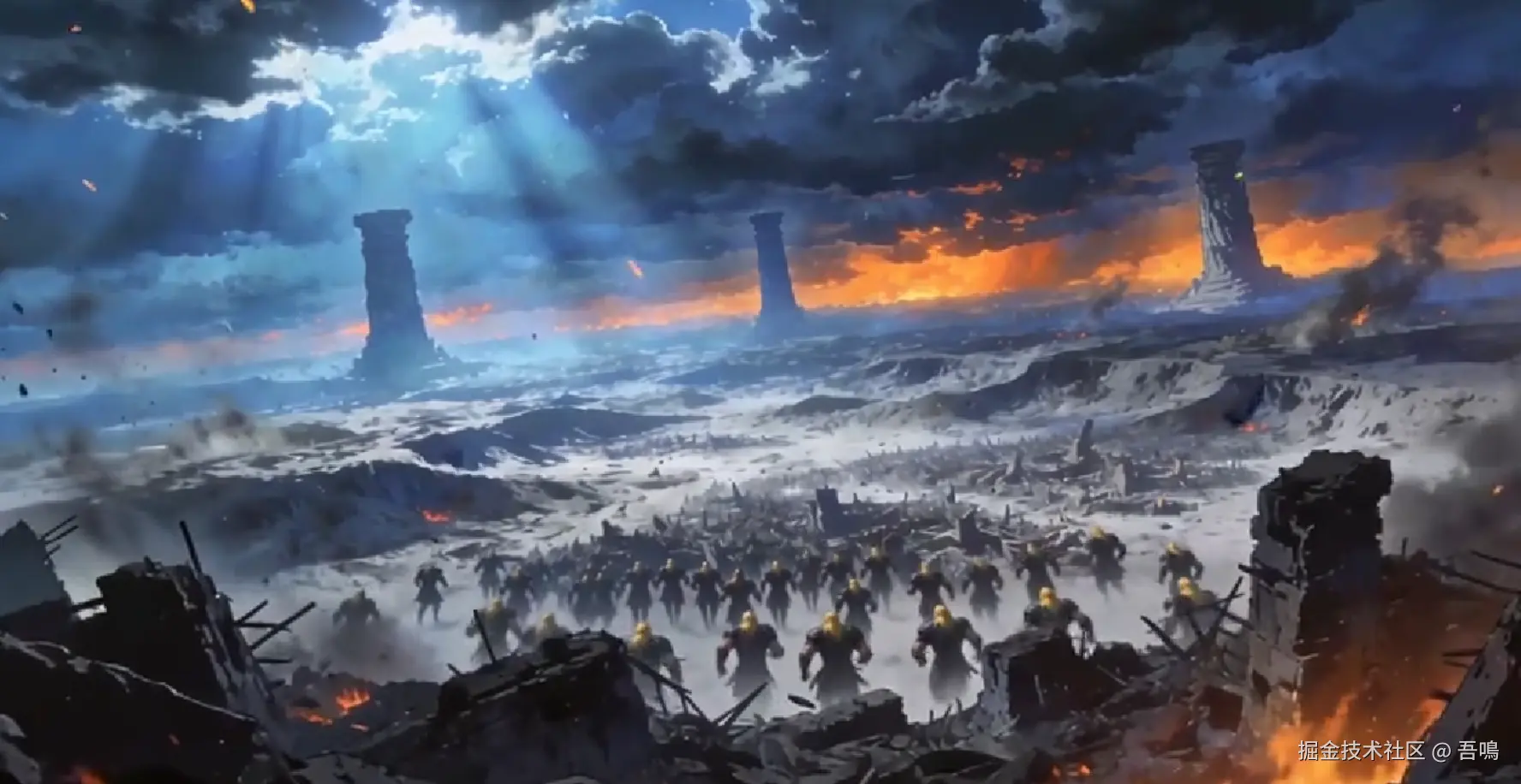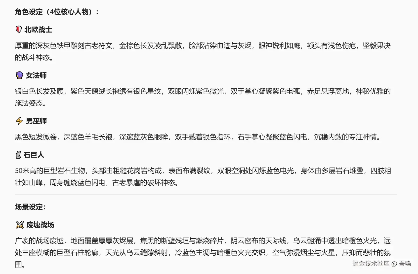 确定了好视频风格之后,便开始对视频中的角色和场景进行设计,根据我的提示词,设计了北欧战士、女法师、男巫师和石巨人四种角色,同时设计了废墟战场这么个场景。
