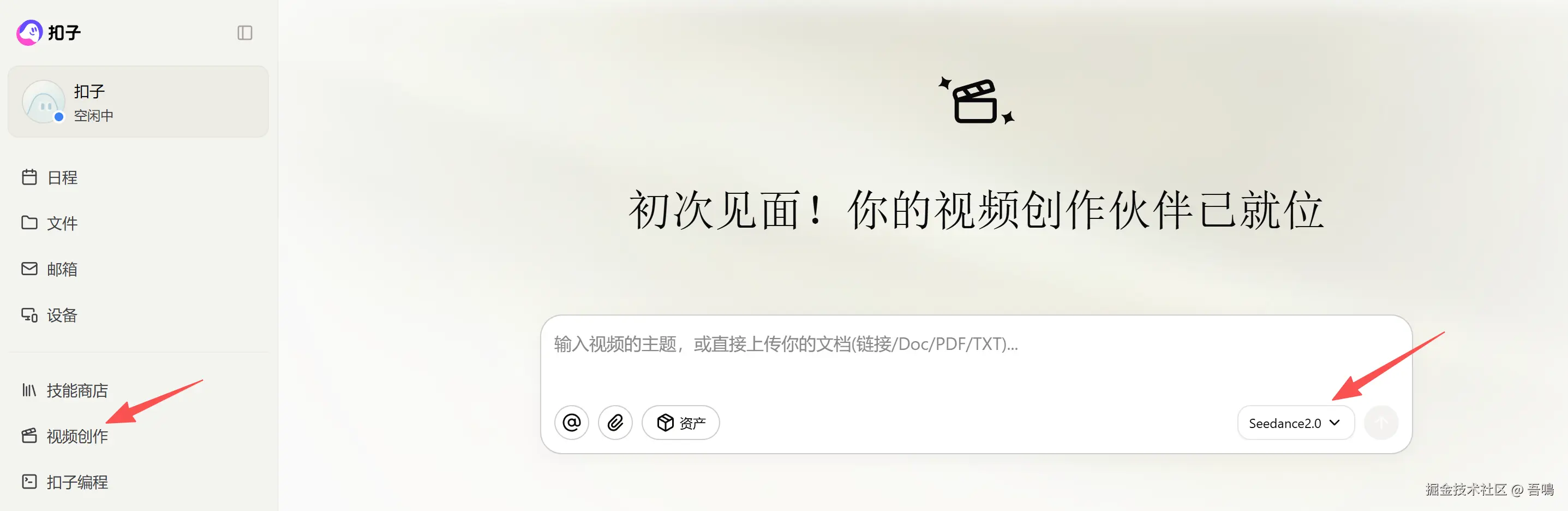 扣子2.5最新发布的Seedance2.0生成视频的入口,位置就是进入到扣子的首页,然后左边的菜单栏中点击"视频创作"的菜单,便可以进入到Seedance2.0的入口了。
