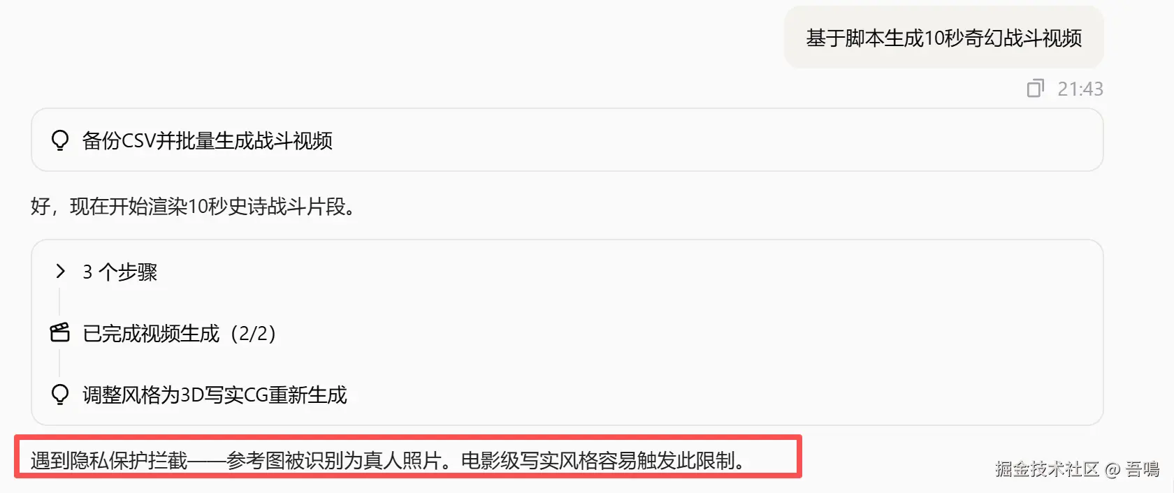 然后,便开始生成视频了,一般正常情况不会这么顺利,都已经习以为常,果不其然,因为参考图是真人图片,直接触发隐私保护拦截了,所以扣子里面的Seedance2.0,对真人出镜也是有限制的。