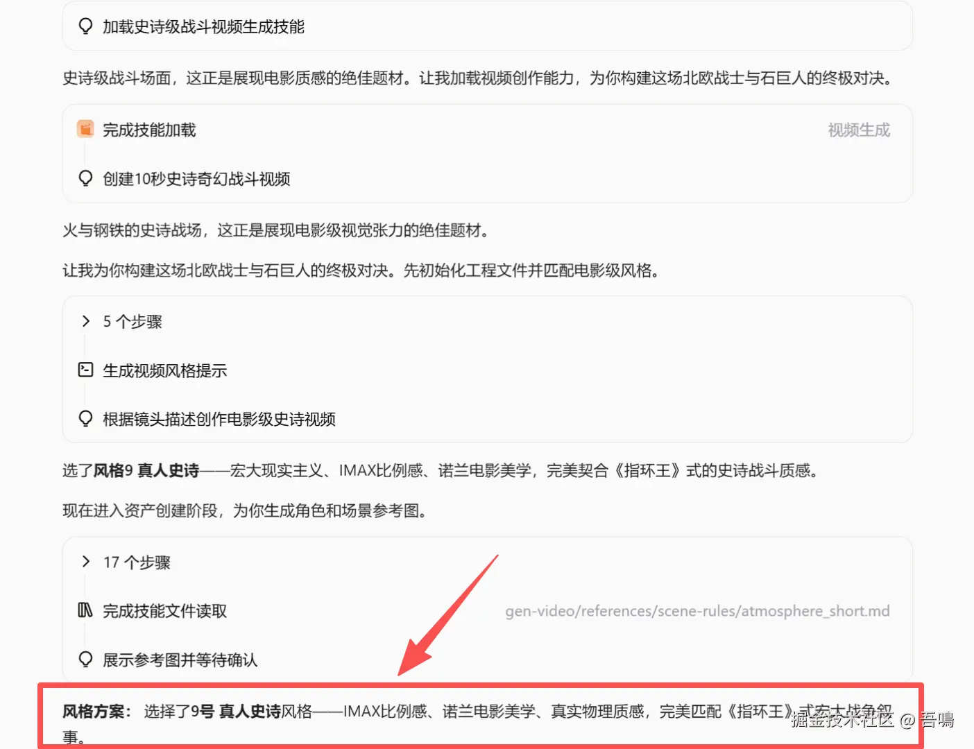 在扣子2.5接收到上面的视频制作的需求之后,它先是开始根据输入确定视频的风格,选择了真人史诗风格,IMAX比例质感。