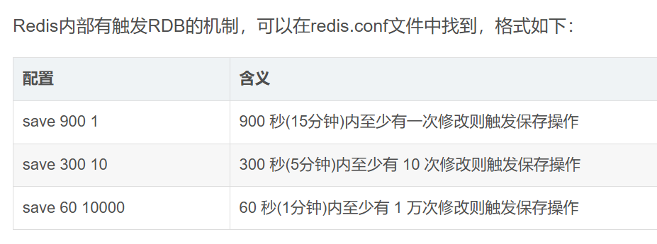 Redis停机时会执行一次save命令,实现RDB持久化。 - 触发RDB条件时