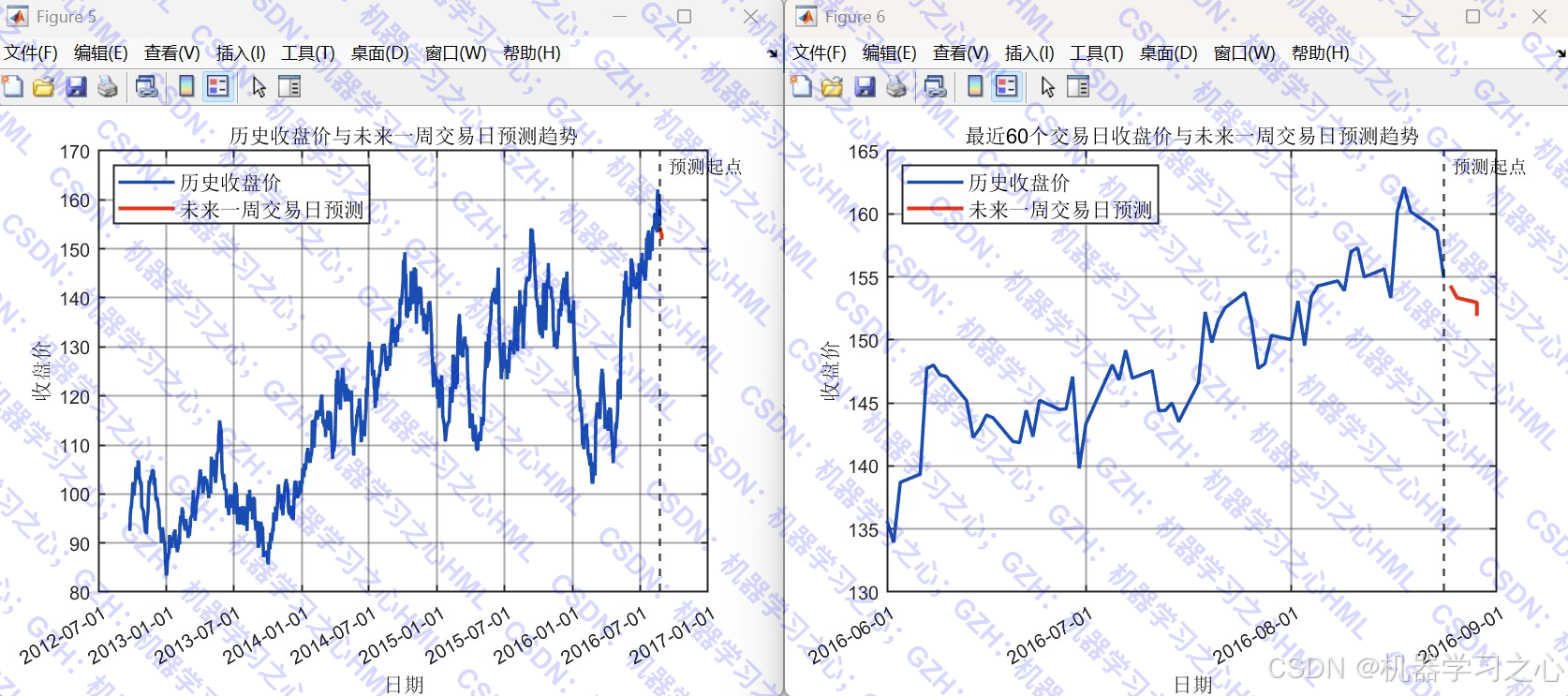 - 利用末段窗口预测未来5个交易日收盘价,并跳过周末生成连续交易日日期。