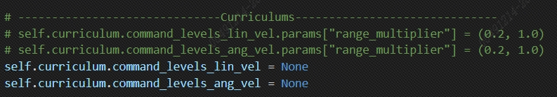 Curriculums课程学习关掉,是一种实践经验,人型机器人训练初期连站立都比较难,更别说速度指令的响应,若是启用了速度课程学习,地形课程学习,机器人由于是初期没学到任何东西,最后全部集中在简单平地上,没办法学习到多态化的地形学习