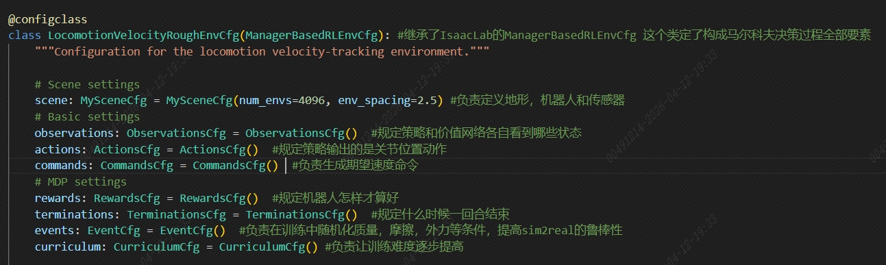 #从本质上说,这个主类的作用把locomotion强化学习任务所有关键元素全部组织成一个标准化,可复用的,可继承的环境模板,为后续不同机器人只要在这个模板上替换自己信息配置,奖励函数权重,少量参数就可以快速构建训练环境
