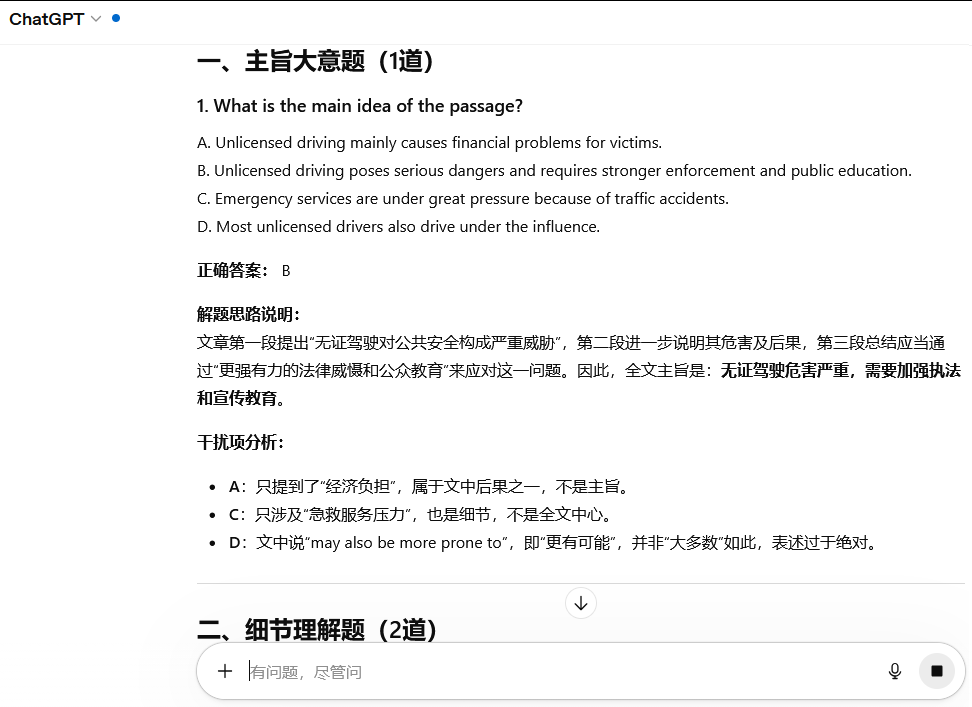 问题四:无法理解作者的隐含意思。这需要培养推理判断能力,学会"读出言外之意"。可以通过GPT-5.4的推理判断训练来提升这一能力。