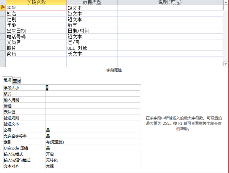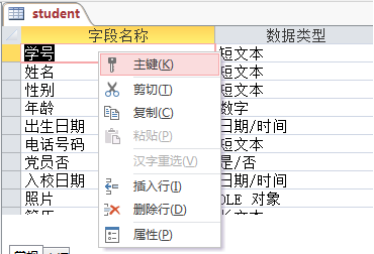 - 设计表结构。在"字段名称"列中输入"学号",在"数据类型"的下拉菜单中选择"短文本"菜单项,完成"学号"字段的添加操作。若不设置字段的数据类型,则默认为"短文本"类型。