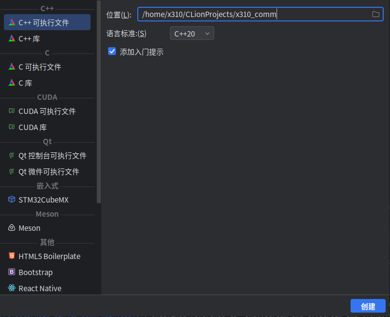 在 CLion 中新建 C++ 项目,命名为 x310_comm。CLion 会自动生成一个顶层 main.cpp 和 CMakeLists.txt,把自动生成的 main.cpp 直接删掉。