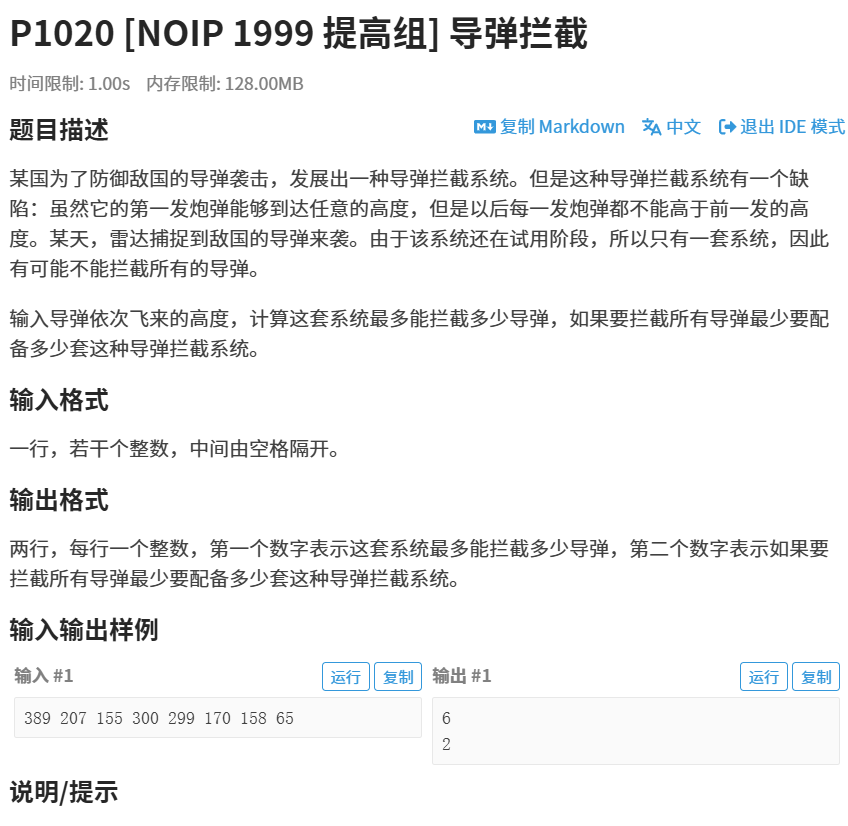 两个小问,第一问要求求出最长的那个导弹长度,题目要求递减,咱们倒过来就是求递增,因为算法只会求递增哈;