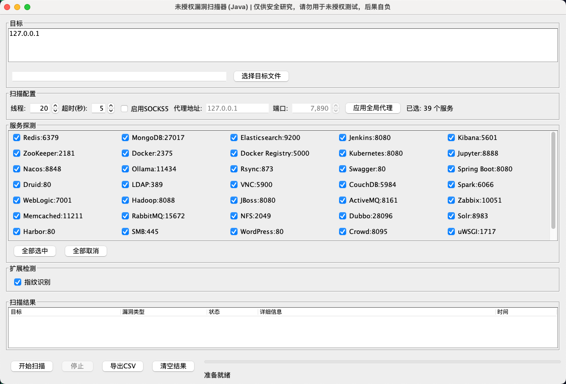 Unauthorized Tools (Java GUI)一个基于 Java Swing 的未授权访问探测工具,支持批量目标、并发扫描、SOCKS5 全局代理、CSV 导出。