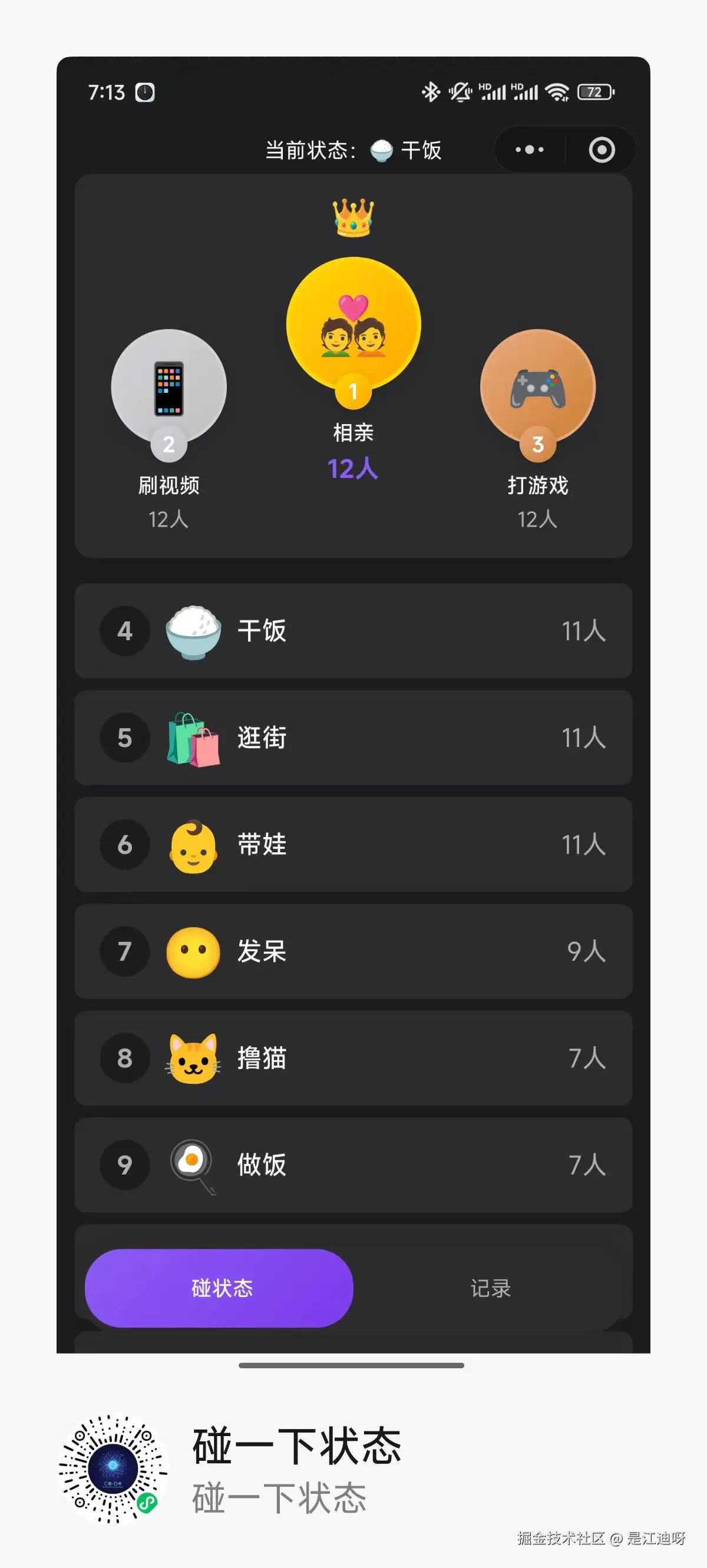 一款可以匿名的实时统计状态人数的小程序,实时看有多少人跟你一样在摸鱼、干饭、发呆,还能发弹幕凑热闹。名称叫做 --------- 碰一下状态,你可以用它: