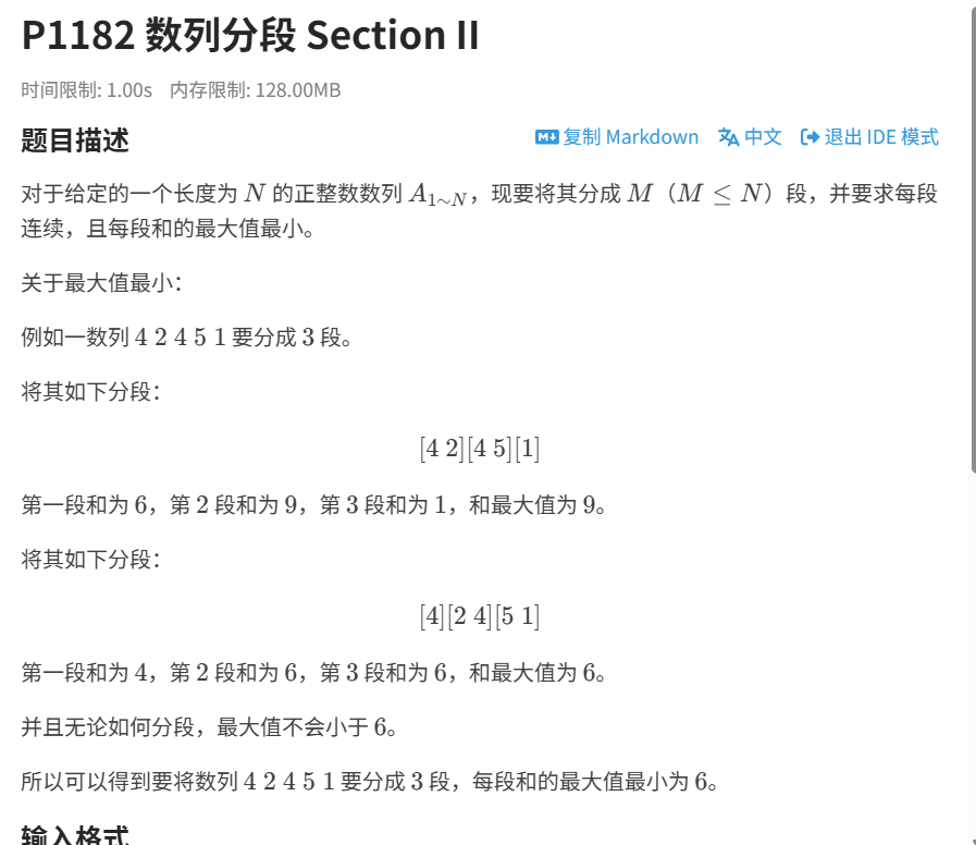 - 核心逻辑 :对于一个候选的最大值 mid,验证是否能将数组分成不超过 M 段 ,且每段和 ≤mid。