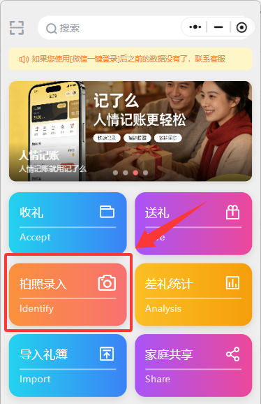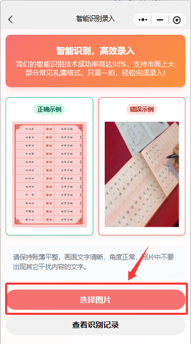 或者在首页-礼薄本-收礼明细-拍照录入:点击按钮进入拍照识别页面。