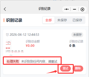 如果遇到任务状态为 [处理失败],可能是系统网络有波动、或者使用人数过多,不用担心,只需要点击【重试】按钮即可重新提交任务工单,系统会再次进行识别(注意:如果重试3次依然失败,可能是上传图片存在问题,请换一个角度重新拍摄上传)。