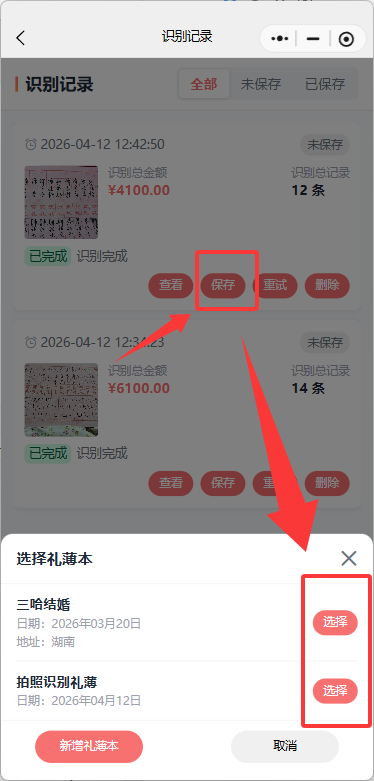 数据核对没问题后,可以批量选择识别记录然后点击【保存到礼薄】,或者点击【保存】可以将识别数据保存到礼薄本中。