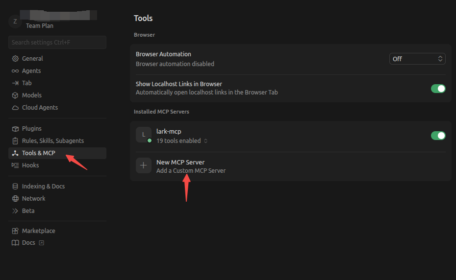 接下来选择Tools&MCP,并选择New MCP Server,因为我已经增加了lark-mcp,所以我这里已经有一个MCP在列表中。