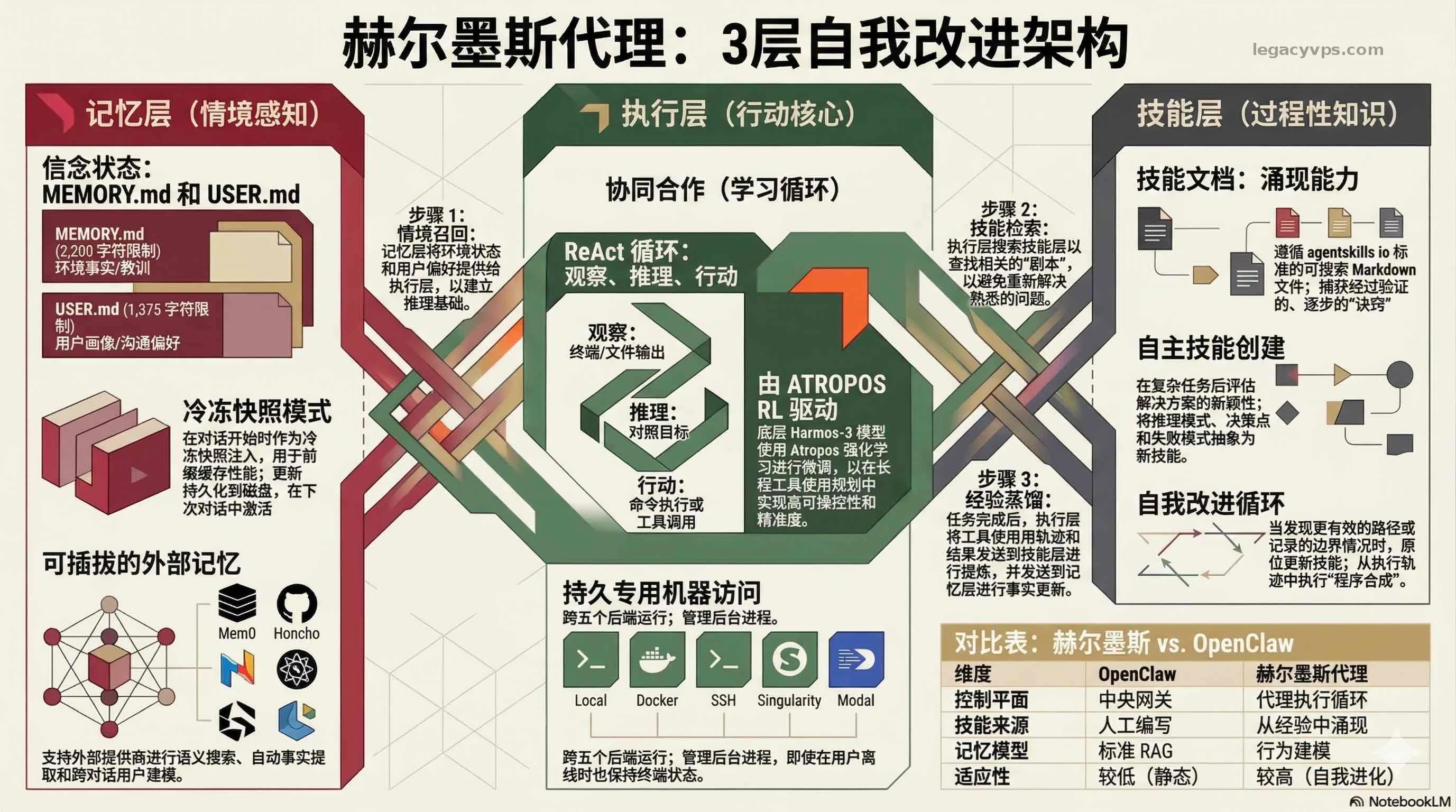 ReAct 循环:观察(读终端输出或文件内容)→ 推理(对照目标分析当前状态)→ 行动(执行命令或调用工具)。驱动这个循环的是 Hermes-3 模型(基于 Llama 3.1),Nous Research 自家的 Atropos 做了专项微调,重点针对工具调用精度和多步规划------跑长任务不容易迷路。